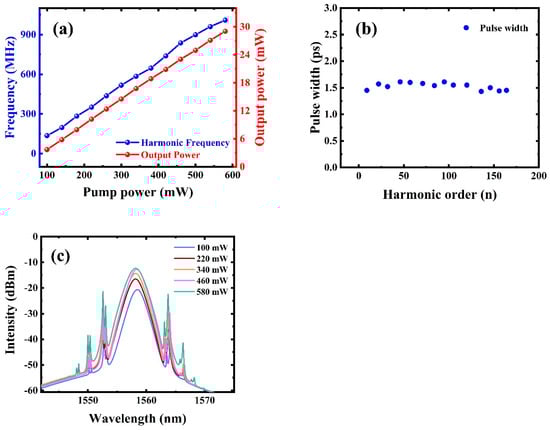 Then, the repetition rate and output powers with different pump powers were evaluated. Figure 7a shows the growth relationship between the repetition rates and the output powers as a function of the pump power. The input power increased from 100 mW to about 580 mW, and the pulse repetition rate almost increased linearly from 135.43 MHz (22nd order) to 1.009 GHz (164th order). As seen in this figure, there was a linear relationship between the output power and the pump power. The growth slope was about 5.3%. When the pump power reached the maximum value of 580 mW, the average output power was about 29.04 mW, corresponding to a lower pulse energy. In addition, the pulse widths under different harmonic orders were evaluated, as shown in Figure 7b. With the increment in harmonic order, the pulse width of the harmonic mode-locked pulses remains between 1.43 ps and 1.61 ps. Figure 7c illustrates the optical spectra of the harmonic mode locked under different pump powers. According to the figure, with increasing pump power, the spectral width of the optical spectra gradually widened, and the corresponding intensities also increased, while the central wavelengths of the optical spectra did not change significantly, i.e., retained at around 1559 nm, indicating these harmonic mode-locked pulses were relatively stable. Due to limited experimental conditions, the long-term stability of harmonic pulses in the fiber laser with the TiN-QD SA could not be evaluated. In fact, the above results mainly focused on highlighting the potential applications of TiN-QD material in the nonlinear optics, suggesting that it can be used as a promising nonlinear optical material. Interestingly, by using TiN-QDs as the SA in fiber lasers, ultrashort pulses with a ~1 GHz repetition rate can be obtained. To the best of our knowledge, this is the highest repetition frequency in a mode-locked fiber laser with TiN material as the SA.
