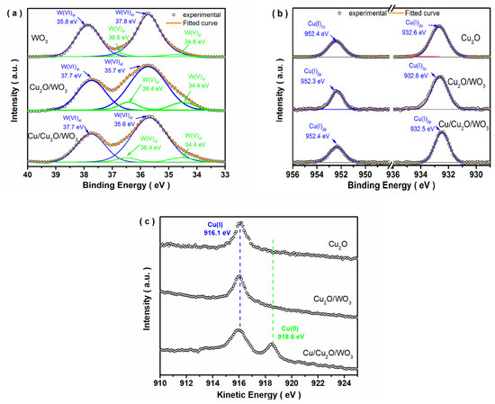X-ray photoelectron spectroscopy (XPS) measurements were carried out to elucidate the surface composition and chemical states of the elements. The survey XPS spectrum of the typical Cu/Cu2O/WO3 sample indicated that the composite mainly consisted of W, Cu and O electrons. To gain further insight into the chemical bonding between W and other atoms in the composite, the high resolution XPS spectrum of W 4f (Figure 2a) was deconvoluted by Gaussian-Lorenzian analysis. The peaks at binding energies of 37.7 and 35.7 eV were ascribed to W (VI) state in tungsten oxide materials, while two distinct peaks at 34.5 and 36.4 eV were consistent with the values of W (V) oxidation state for all the samples [42,43]. The existence of W (V) was necessary to maintain the opening structure of hexagonal WO3 [14]. However, the area ratios of W (V) and W (VI) in the composite were higher than those of the bare WO3 sample (Table S1) due to the electroreduction process for Cu2O deposition. In the high-resolution Cu 2p XPS spectrum (Figure 2b), two conspicuous peaks were observed at binding energies of 952.3 eV for Cu (I) 2p1/2 and 932.5 eV for Cu(I) 2p3/2 [44]. Furthermore, the Cu and W diffraction peaks of the composite shifted slightly compared with those of pure samples, which was the reason that the intense interaction existed between WO3 and Cu2O component in the composites, implying the formation of heterojunction. Cu LMM Auger spectra (Figure 2c) were further performed to explore the chemical state of the Cu element, The Auger parameter can be calculated from the equation of α′ = Ek (Auger electron) + Eb (photoelectron). Here, Ek is the kinetic energy, and Eb is the binding energy. The Auger parameter values of the Cu (I) and Cu (0) in the Cu/Cu2O/WO3 composite were determined to be 1848.7 and 1851.2 eV, respectively, which indicated the existence of Cu (I) and Cu (0) in the Cu/Cu2O/WO3 sample [45,46].