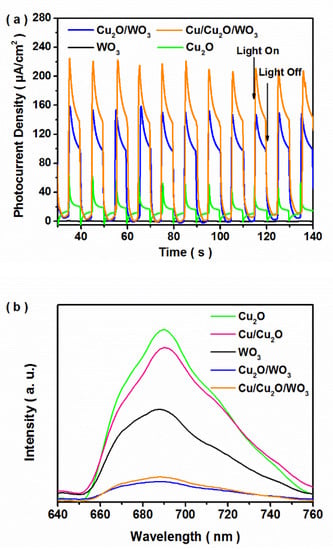 Transient photocurrent response and photoluminescence spectra were measured to investigate the charge separation. Based on the photo-electric properties during several on–off illumination cycles (Figure 7a), the photocurrent density of Cu2O/WO3 was higher than those of the bare WO3 and Cu2O samples, and the Cu/Cu2O/WO3 sample exhibited the highest photo-induced density among them. Moreover, the photoluminescence spectra of the photocatalysts at the excitation wavelength of 405 nm are present in Figure 7b, and the emission intensity of the Cu/Cu2O/WO3 composite distinctly decreased compared with those of the WO3, Cu2O and Cu2O/WO3 samples. The above results indicate the promoted separation of photogenerated electron-hole pairs in the Cu/Cu2O/WO3 composite.
