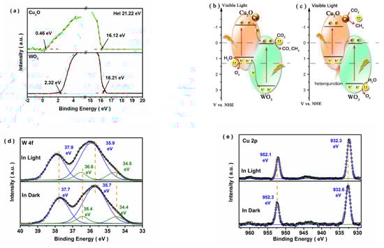 The band edge position and charge transport mode in the composite directly influenced the separation and redox ability of photoexcited charge carriers. Ultraviolet photoelectron spectra combined with Eg analysis were used to determine the electronic band structure of the catalyst. Figure 8a shows the UPS spectra of Cu2O and WO3. On the basis of the linear intersection method [48], the valence band (VB) of WO3 was estimated to be −7.33 eV (vs. vacuum), and the conduction band (CB) was −4.47 eV (vs. vacuum) based on the Eg value of WO3. According to the connection between vacuum energy and normal electrode potential (NHE) [29], the corresponding VB and CB positions of WO3 were 2.89 and 0.03 eV (vs. NHE), respectively. Similarly, the VB and CB values of Cu2O were separately calculated to be 0.91 and −1.14 eV (vs. NHE), which agreed well with previously reported results [31,49]. Hence, the heterostructure with staggered band alignment was successfully formed in this Cu2O/WO3 system, assuming that the possible band bending of the semiconductor was neglected. Based on the band energy structure of WO3 and Cu2O, two possible mechanisms for photo-induced carriers were proposed and described in Figure 8b,c. If the photo-excited charge carriers transferred according to the traditional model (Figure 8b), the photo-excited holes in the VB of WO3 would transfer to the VB of Cu2O, and the photo-excited electrons in the CB of Cu2O would migrate to the CB of WO3, where the accumulated electrons would not reduce CO2 to CO/CH4 or produce H2 from H2O on account of the more positive CB edge potential (0.21 eV vs. NHE) than the standard CO2 reduction potential [4]. Similarly, the accumulated holes in Cu2O would not accomplish H2O oxidation due to the more negative VB of Cu2O. Hence, the hypothesis of the traditional double-transfer model was invalid. The S-scheme charge transfer mode (Figure 8c) was proposed according to the enhanced photocatalytic activity of Cu/Cu2O/WO3. To verify the S-scheme charge transfer mode in this heterojunction, the XPS spectra of Cu2O/WO3 were measured in light and the results were shown in Figure 8d,e. The CB of Cu2O and WO3 were composed of Cu and W orbitals, respectively. Four peaks of W 4f in light shifted to a higher binding energy compared with these in the dark. Simultaneously, two peaks of Cu 2p in light reversely shifted. It was implied that the photo-induced electrons transferred from WO3 component to Cu2O component in this heterojunction [50,51]. Specifically, the photoexcited holes in the VB of Cu2O would transfer to WO3 and recombine with the photoexcited electrons in the CB of WO3. The CB potential of Cu2O and VB potential of WO3 thermodynamically realized photocatalytic CO2 reduction and H2O oxidation, respectively, and the metallic Cu co-catalyst facilitated the reduction process dynamically.