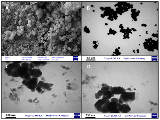 FE-SEM of Met-NiFe2O4 nanoparticles (A), TEM images of NiFe2O4 nanoparticles (B), Met-NiFe2O4 nanoparticles (C), and Tet-Met-NiFe2O4 nanoparticles (D).