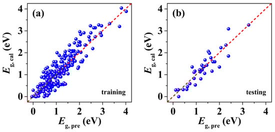 Figure 2 shows the intuitive linear correlation between the SISSO-predicted gaps () and those calculated by using HSE scheme (). It is obvious that both the training (Figure 2a) and testing data (Figure 2b) are evenly distributed around the dashed line with slope one, suggesting the higher prediction accuracy of our SISSO descriptor. Indeed, the Pearson correlation coefficient is found to be 94% and 92% for the training and testing sets, respectively.