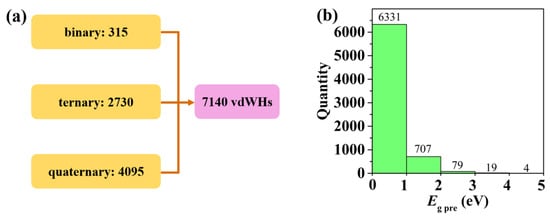 (a) Schematic illustration of 7140 AB/CD vdWHs, which includes 315 binary, 2730 ternary, and 4095 quaternary systems. (b) Distribution of 7140 vdWHs according to their SISSO-predicted band gaps.