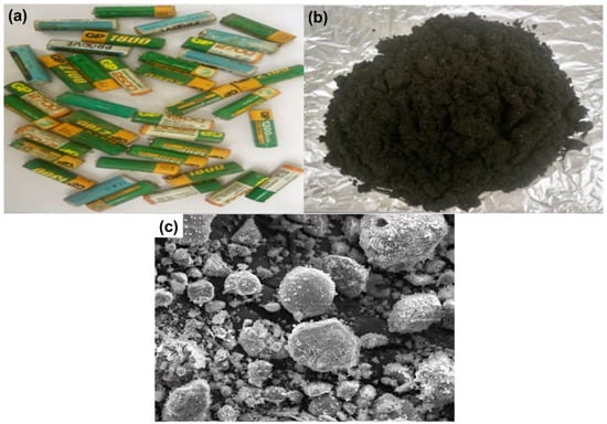 (a) Spent nickel–metal hydride (Ni–MH) batteries; (b) Black powder of Ni–MH batteries; (c) SEM of the obtained black powder of Ni–MH batteries.