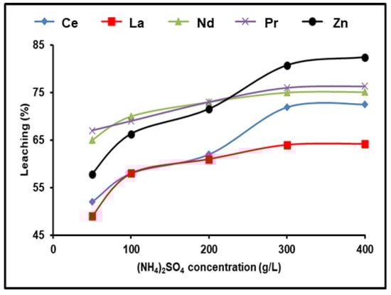 On the other hand, ammonium sulfate plays a foremost role in the selective extraction of REEs and Zn from various media. Ammonium compounds have become one of the most popular leachants for extracting rare earth elements in recent years. Moldoveanu and Papangelakis used (NH4)2SO4 to leach and recover REE ions [,]. Kim et al. also used a 1.0% concentration of (NH4)2SO4 to leach REEs from Vietnamese ore []. The use of ammonium sulfate has the advantages of reduced reagent use and increased final product purity [].