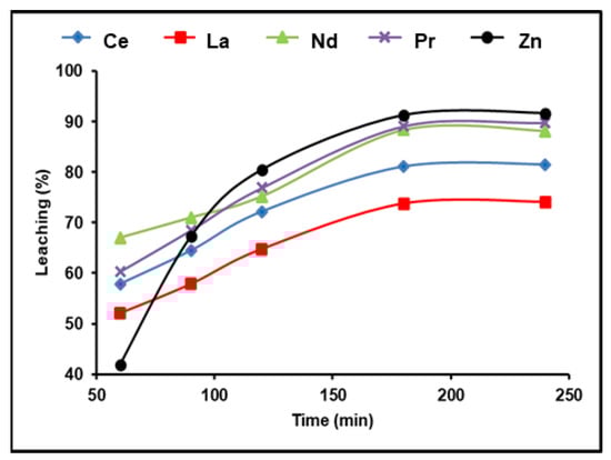 A 300 g/L (NH4)2SO4 and 1:2 (S/L) ratio solution was used to test the time effect on rare earth metal leaching at 90 °C and a pulp density of 100 g/L. The obtained results in Figure 3 demonstrate that the amount of REEs recovered improved as the amount of leaching time increased. A La leaching efficiency of 74.1%was achieved after 180 min; further leaching efficiencies were found as 88.4% for Nd, 89.1% for Pr, and 81.5% for Ce. Any additional increment in the leaching time after 180 min had no influence on the leaching efficiency of the five elements. We found that 180 min of leaching yielded the greatest amount of dissolution of the REEs and also attained about 92% leaching efficiency for zinc.