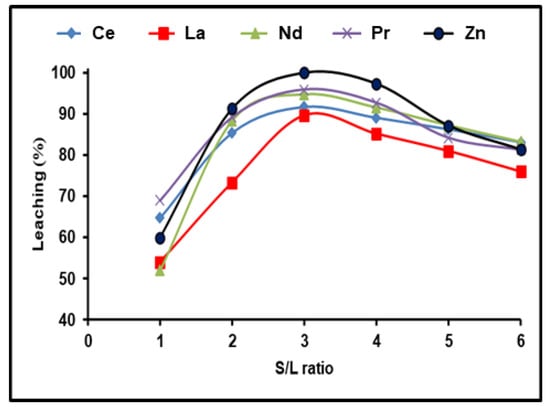 REE dissolving efficiencies were studied in the range between 1:1 and 1:6 depending on the solid/liquid ratio. For these trials, the stable dissolution conditions included 300 g/L (NH4)2SO4 and an incubation time of 180 min with a dissolving temperature of 90 °C. REE leaching efficiency was found to increase with increasing the S/L phase ratio to 1:3, followed by a reduction as the S/L ratio increased from 1:4 to 1:6 (Figure 4). This may be because REEs precipitate as mono-sulfates. It is clear that all the available REEs reacted with ammonium sulfate in the solution until achieving equilibrium, after which any excess of (NH4)2SO4 had no effect on the REE leaching efficiency. As a result, a S/L phase ratio of 1:3 yielded the highest possible dissolution efficiencies of 91.7, 89.4, 94.7, and 95.9% for Ce, La, Nd, and Pr, respectively, and almost 100% for Zn.