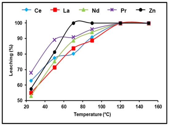 The effect of temperature on the solubility of various REEs extant in spent Ni–MH powder was investigated throughout a temperature ranging between 25 and 150 °C. The obtained data in Figure 5 show temperature’s substantial influence on obtaining the highest REE leaching efficiency. At ambient temperature and experimental conditions of 300 g/L of (NH4)2SO4, 180 min, and a 1:3 S/L phase ratio, 62.81, 55.3, 53.4, and 68.7% of Ce, La, Nd, and Pr were leached, respectively. The dissolution efficiency reached its maximum when raising the leaching temperature to 120 °C and any further raise in temperature did not demonstrate any significant improvement in the leaching of the REEs. Consequently, we found that the satisfactory dissolution temperature of Ce, La, Nd, and Pr was 120 °C under the previously mentioned conditions.