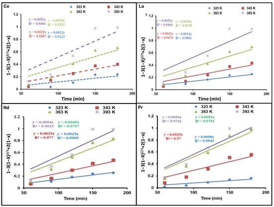 Figure 6 and Figure 7 demonstrate diagrams of 1 − 3(1 − x)2/3 + 2(1 − x) as well as 1 − (1 − x)1/3 against dissolution time; they indicate how temperature affects REE reaction kinetics. The plots show straight lines for Ce, La, Nd, and Pr at various temperatures. As presented in Figure 6, the kinetic data are not a good fit for the diffusion control model. Nevertheless, the calculated R2 values in Figure 7 are above those of the diffusion control model, indicating that the kinetic results match well with the chemical control model.