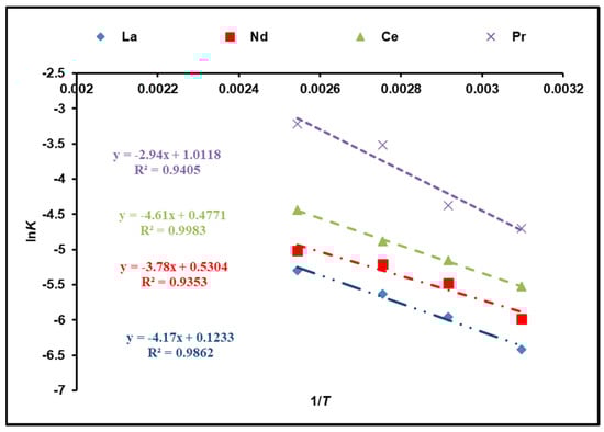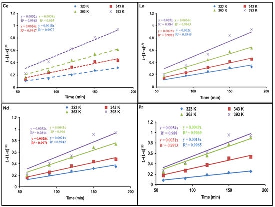 where Ea (kJ/mol) is attributed to the activation energy, A corresponds to the Arrhenius constant, and R is 8.314 J/mol K. Figure 8 illustrates a plot of lnK against 1/T. According to the calculations, the activation energies of cerium, lanthanum, neodymium, and praseodymium in the temperature range of 323–393 K are 38.33, 34.67, 31.43, and 24.44 kJ/mol, respectively, which was determined from the slope. As a result, the obtained results are rather suitable for the model of a shrinking core (SCM) with a chemical reaction as a rate-determining step [,].