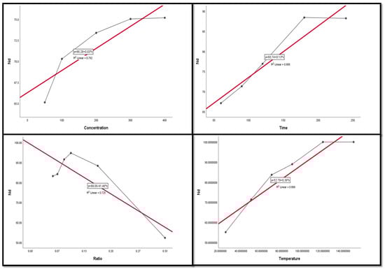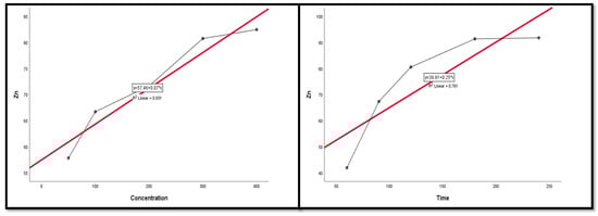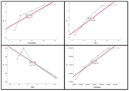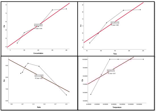 Figure 9, Figure 10, Figure 11, Figure 12 and Figure 13 display the scatter plot of the linear regression fit for the leaching efficiency of the five elements against different factors, which confirmed the same results with regards to where the relationship was positive and strong with the (NH4)2SO4 concentration, leaching time, S/L phase ratio, and temperature. It is noteworthy to mention that at the start point there was no leaching and that if any variable was set to equal 0, there was no possible leaching. Additionally, it is of note that the (NH4)2SO4 concentration and time of Ce, Pr, and Zn leaching had a stronger positive effect than temperature, while the impacts of temperature and time on Nd and La were stronger than that of (NH4)2SO4 concentration. On the other hand, it is clear that there was a strong negative relationship between the solid/liquid phase ratio and the leaching efficiency of the REE metals.