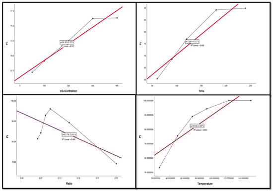 The scatter plot with linear regression fit for Pr leaching efficiency, %, and factors.