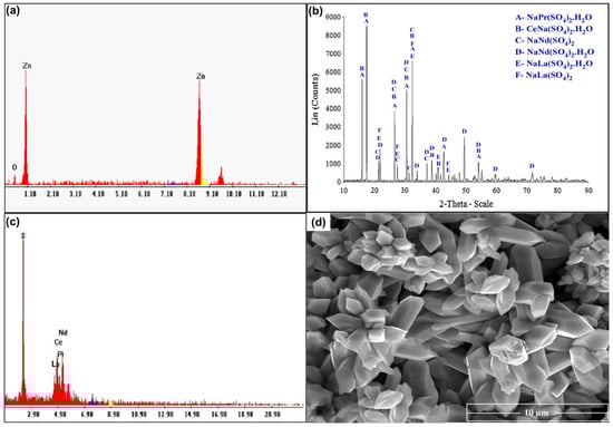 For studying the recovery procedures for REEs from the spent Ni–MH battery powder, proper ammonium sulfate leach liquor was prepared using the previously studied optimum leaching conditions. Leached REEs can be recovered through precipitation as their hydroxides or else via selective REE precipitation as sulfates or oxalates. Leached Zn and REEs can be recovered via co-precipitation as their hydroxides at a pH of 8.0. Zn(OH)2 can be precipitated from its salt solution by adding a suitable base. An excess of alkali base quickly dissolves Zn(OH)2 as sodium zincates such as NaZn(OH)3 and Na2Zn(OH)4 []. The Zn was removed from the solution using CO2 gas to precipitate it as ZnO, as seen in Figure 14a. After removing ZnO, the rare earth elements were precipitated as double insoluble sulfate salts using sulfuric acid, which was validated by XRD, as presented in Figure 14b. There were several phases detected in the solution such as the following salts: NaCe(SO4)2.H2O, NaPr(SO4)2.H2O, NaNd(SO4)2.H2O, NaNd(SO4)2, NaLa(SO4)2H2O, and NaLa(SO4)2. Additionally, the EDX spectrum confirmed the structure of REEs, as given in Figure 14c. The concentration of elements in the product was determined to be 45.7% S, 17.5% La, 14.83% Ce, 11.17% Nd, and 10.8% Pr. The SEM image in Figure 14d shows a hexagonal shape of RE sulfate salts, which are fully developed. It shows well-structured and tiny particles of 5–6 µm in length and 1–2 µm in width.