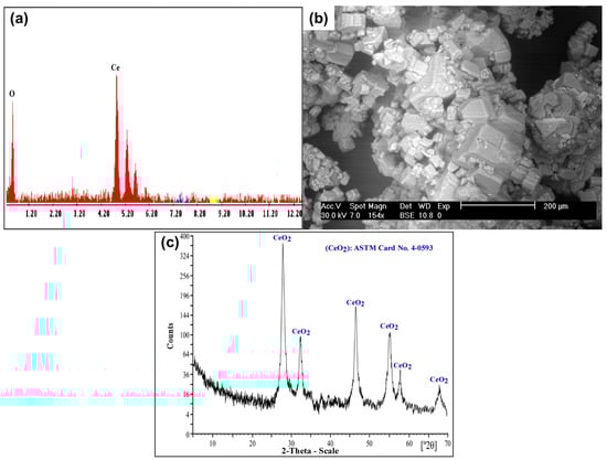 The yellowish insoluble Ce(IV) was separated from the chloride leach liquor. Subsequently, several washes with distilled H2O were performed to eliminate the excess of Cl− ions from the yellowish Ce(IV) precipitate. The obtained product was confirmed using SEM–EDX and XRD analysis, as shown in Figure 16.