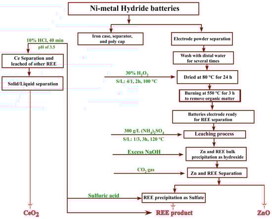 Flowsheet for the recovery of REEs from Ni–metal hydride batteries.