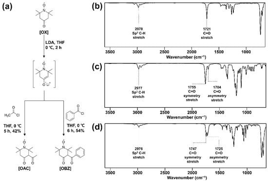 Characteristics of TEMPO derivatives: (a) synthetic scheme with molecular structures, and infrared spectrum of (b) OX, (c) OAC, (d) OBZ.
