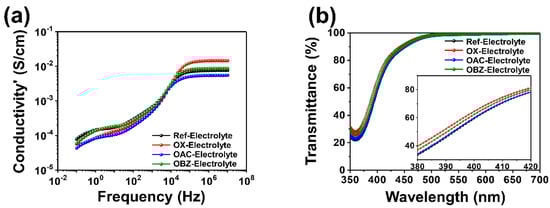 Various solid-state electrolytes were manufactured by impregnating an iodine-based commercial electrolyte without or with the TEMPO derivatives such as OX, OAC, and OBZ into the Li-TFSI film, respectively. Figure 2a shows the electrical characteristic of the solid-state electrolytes with the various TEMPO derivatives. The high ionic conductivity of the OX-enhanced electrolyte provides the potential for high-performance SS-FDSSCs by causing improved PCE through improved short-circuit current density (JSC) value due to efficient charge extraction from the electrolyte to the dye. The results indicate that the 4-oxo functional group of the TEMPO derivative is more effective in enhancing the ionic conductivity than either the acetyl-oxo or the benzoyl-oxo group. In detail, it can be interpreted that the electron density of OX decreases by introducing a carbonyl group having an electron-withdrawing effect at position 4 of TEMPO, which reduces the oxidizing power of OX, resulting in an increase in the ionic conductivity of the electrolyte. On the other hand, when comparing OAC having a methyl group on the carbonyl group and the OBZ having a phenyl group on the carbonyl group, in OBZ, it can be interpreted that the electron-withdrawing effect may be offset by conjugating π-electrons of the phenyl group and π-electron of the carbonyl group with each other. Hence, it can be inferred that OAC with the methyl group has an increased electron-withdrawing effect, and its ionic conductivity is lower than that of OBZ, which is relatively small because the electron-withdrawing effect is offset. The UV-Vis transmittance of TEMPO derivatives with various functional groups such as OX, OAC, and OBZ was measured to investigate the optical characteristic, as shown in Figure 2b. The enhanced electrolytes show broad transmittance at about 380 to 500 nm, as shown in inset of Figure 2b. As the absorption rate of OX and OBZ is relatively lower than that of the reference electrolyte, the OX- and OBZ-enhanced electrolytes exhibit higher transmittance than the pristine electrolyte. On the other hand, although OAC has a slightly lower, or almost similar absorption rate to the pristine electrolyte, so the difference is expected to be insignificant. Hence, it was expected that the JSC of the SS-FDSSCs with the OX- and OBZ-enhanced electrolytes could be increased as a result of efficient exciton harvesting due to enhanced incident light flex into the dye, whereas the OAC could not.