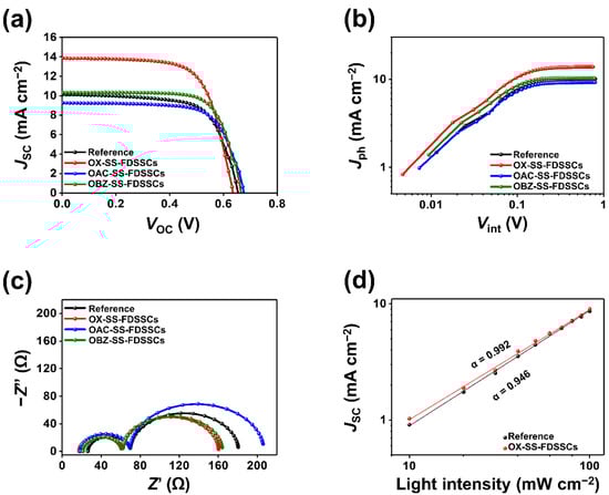 Characterization and photovoltaic properties of TEMPO-SS-FDSSCs devices: (a) J–V curves, (b) photocurrent density as a function of internal voltage, and (c) nyquist plots measured by EIS data. (d) Measured JSC of OX-enhanced SS-FDSSC plotted against light intensity (symbols) on a logarithmic scale. Fitting a power law (solid lines) to these data yields α.