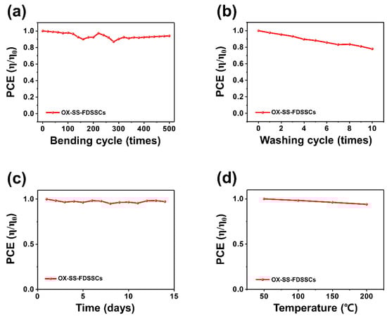 The SS-FDSSC, which uses Ox-enhanced electrolyte, showed a remarkable degree of flexibility and durability, as shown in Figure 4a and Figure S6. The PCE of the OX-enhanced SS-FDSSC, with a radius of approximately 5 mm, changed slightly to almost 94% after 500 bending cycles. This is because wearable electronics must be both flexible and washable. Washing tests of OX-enhanced SS-FDSSC were carried out in an automatic washer, as shown in Figure 4b and Figure S7. During the 10 repeated washing tests, the device stability tests showed a little degradation in the device performance. These results indicate that OX-enhanced SS-FDSSCs have excellent characteristics as wearable electronic devices. The stability for JSC and VOC were also presented to provide more information on the stability test for bending and washing, which can be seen in Figure S8. An aging test was carried out to assess the stability of the fabricated OX-enhanced SS-FDSSCs under indoor ambient conditions, as shown in Figure 4c. The devices exhibited reasonable stability for 14 days. Durability of OX-enhanced SS-FDSSC against extreme environments was tested to high temperature up to 200 °C, as shown in Figure 4d. The PCE of OX-enhanced SS-FDSSCs maintained an efficiency of 93% compared to the initial efficiency even in hot environments with increasing temperature.