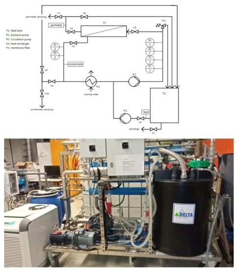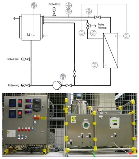 In order to find a suitable UF membrane, preliminary tests were carried out. For the experiments of the UF and RO flatsheet membranes, the laboratory membrane test system LSta80 from SIMA-tec (41366 Schwalmtal, Germany) was used. The flow diagram of the plant is shown in Figure 2. The plant can be used for investigations in the field of microfiltration, UF, nanofiltration and RO and can be operated with a pressure of up to 100 bar. Organic flat film membranes with an active membrane area of 86 cm2 were used. The system has a double-walled feed tank with a capacity of 7.5 L, which was kept at 20 °C by a temperature regulator. Manual valves allow samples to be taken from the feed, concentrate and permeate streams during operation. The readings for TMP, flow rate, electrical conductivity and pH were taken continuously and a data point were recorded every third second.