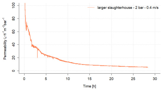 The permeability and the rejection of water impurities were investigated in the first experiment with the UF flat sheet membrane. The TMP was kept constant at 2 bar and the permeate was continuously withdrawn until a yield of 80% was achieved. The permeability trend versus time is shown in Figure 5. It can be seen that the permeability decreases strongly with time and drops from initially over 100 to 5.2 L·h·m·bar by the end of the experiment.