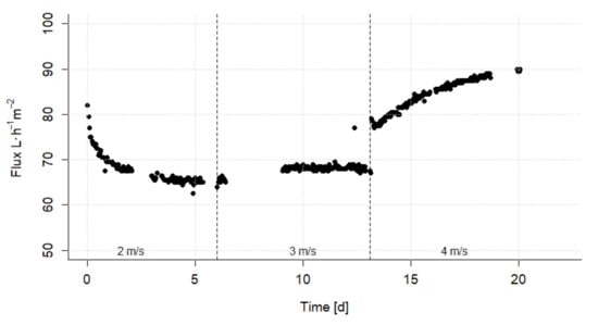 In the second phase of the experiments, the influence of the cross-flow velocity on the flux at a constant pressure of 1.5 bar was investigated. The results are shown in Figure 7. The cross-flow velocity of 2 m·s led to a strong decrease of the flux to 65 L·h·m2. By increasing the cross-flow velocity to 3 m·s, the flux improves only slightly. The further increase to 4 m·s resulted in a rising flux up to 90 L·h·m2. Thus, it can be observed that the change in the surface layer can be controlled by adjusting the cross-flow velocity and that this effect is partially reversible.