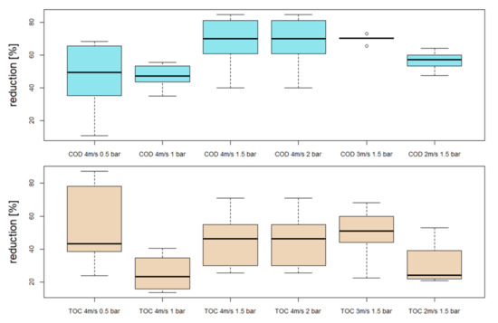With regard to the rejection rates of the membrane under different operating conditions, it was observed that for the parameters TN and turbidity, the reduction was comparatively constant for all experiments at 10% and 97%, respectively. However, significant fluctuations were observed for the parameters COD and TOC. The reduction of the parameters COD and TOC at the different operating conditions are shown in Figure 8, only samples taken during stable operation, defined by small fluctuations in flux, were considered. On average, the highest rejection rates were achieved at 1.5 and 2 bar. Consequently, the best overall performance was achieved with a TMP of 1.5 bar and a cross-flow velocity of 3 m·s. It can be observed that increasing TMP at the same cross-flow velocity leads to a compressed surface layer which seems to reject COD and TOC better. However, with 3 m·s the transport through the layer is reduced. Similar results could also be observed in the work of Boyle-Gotla et al. [17] and Thomassen et al. [18].