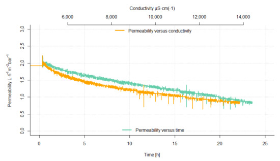 The feed for this experiment was the permeate produced with the long-term UF experiments described in Section 2.3.2. It should be noted that the concentrations of the impurities are slightly lower because of the dilution by the residual water in the plant at the beginning of the experiment. The permeability as a function of the electrical conductivity for the various TMPs is shown in Figure 12. The permeability increases at all pressure levels with the electrical conductivity from 1.2 L·h·m·bar to 1.4 L·h·m·bar. However, this can be explained by the increasing temperature. Dividing the permeability by the respective temperature gives a normalized permeability of 0.06 L·h·m·bar·°C at the beginning of the experiment (2000 µS·cm) and 0.05 L·h·m·bar·°C at the end of the experiment (4000 µS·cm). So the normalized permeability decreases with increasing electrical conductivity, which can be explained by the rising osmotic pressure. Consequently, no scaling effects can be observed over a period of 24 h.
