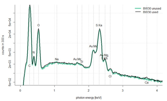 Energy dispersive radiography spectroscopy of sheet membrane BW30 before and after experiment.