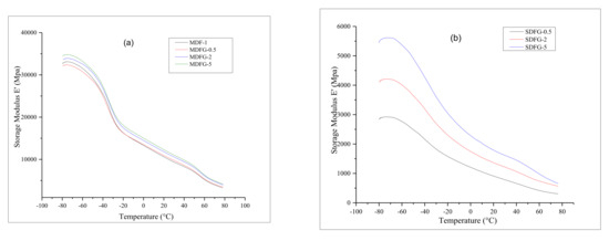 Dynamic mechanical analysis was performed to determine the various dynamic mechanical properties, such as storage modulus E′, loss modulus E″, and damping coefficient tan δ of the prepared samples as a function of temperature from −80 °C. Nanocomposites made using melt mixing generally showed poor dispersion in the matrix and poor interfacial bonding between the polymer and graphene because of the graphene’s high-aspect ratio, very high specific surface area, and high surface energy [18]. In contrast, better dispersion of graphene into the polymer matrix has been reported using the solution-cast method. Thus, dynamic mechanical properties were measured to confirm the dispersibility of graphene and the relative interactions between the polymer and the filler. Figure 3a,b shows the storage modulus of the composites prepared by mix-melting and solution-casting methods, respectively.