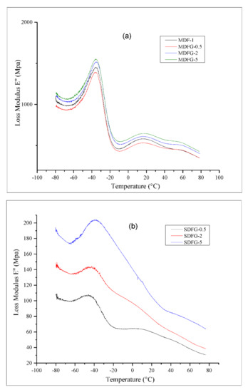 Figure 4a,b shows the loss modulus for various nanocomposites prepared by both methods as a function of temperature (−80 °C to +80 °C). Loss modulus increased with graphene nanoplatelet loading. The glass transition temperatures (Tg) of both composites were clearly observed. In the case of melt-mix composites, the Tg peak at around −40 °C was very sharp for all samples with different loadings of graphene, and loss modulus increased with increasing graphene content from 0.5 wt% to 5 wt%. The loss modulus peak indicates interactions between the filler and matrix. It is also associated with changes in internal frictions between the filler and the matrix, molecular motions, morphology, and the dispersion between the filler and the matrix. Single and strong peaks indicate the good interfacial interactions and no-phase separation. The drop in loss modulus after the maximum peak is suggested by the free movement of the polymer chain present in the system [25]. The beta relaxation of polymer composites at 20 °C and gamma relaxation at 60 °C were clearly observed, which indicates the presence of polymer mobility even after addition of graphene nanoparticles. In contrast, the solution-cast nanocomposites showed a wide Tg, around −40 °C to −43 °C. The shift in Tg with increasing graphene content indicated the stiffness of composites achieved by adding 5% graphene nanoparticles, which reduced the mobility of the polymer chains. The beta relaxation of composites with 0.5% added graphene was clearly observed; however, it was reduced by the further addition of graphene nanoparticles.