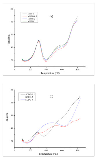Figure 5a,b shows the delta T, which is the main indication of the Tg of the composites. The Tg of the polymer can be altered by the addition of rigid filler particles. The addition of graphene can alter the Tg of composites, which is explained by [26]: (i) decreasing the mobility of polymer chains by the addition of graphene; and (ii) restriction of segmental motion by graphene layers.