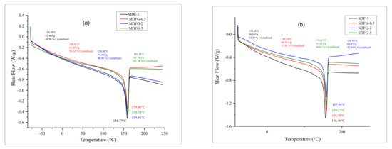 The DSC crystallization curves in Figure 6a, b were analyzed to evaluate various thermal properties and crystallinities, as shown in Table 2. Table 2 shows the crystallization (Tc onset and Tc peaks), crystallization of enthalpy (ΔHc), and percentage of crystallization (Xc) as a function of graphene content.