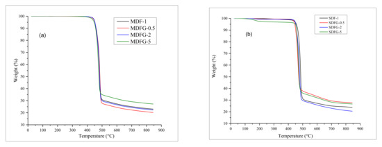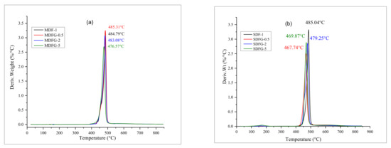 Analyzing the TGA curves of nanocomposites prepared by the mix-melt method present a good thermal stability for 0.5–5% graphene samples, as no significant mass changes occurred until a temperature of 400 °C. Initial onset degradation started at 429 °C for 5% graphene composites and around 425 °C for virgin PVDF and 0.5–2.0% graphene PVDF nanocomposites. The earlier degradation of 5% dispersed graphene than that of the 0.5–2% graphene nanocomposites might be due to the presence of volatile impurities in graphene molecules. The literature reports that there are competing factors for graphene loading to dictate the thermal stability, i.e., the action of graphene as a physical barrier to increase the thermal resistance and the presence of oxygenated functionalities to decrease the thermal stabilities; trend reversal may happen at higher loadings of graphene [43,44]. The onset and maximum temperature of degradation are shown in Table 1. Figure 7a shows that 0.5% graphene nanocomposites have the highest temperature at 485.31 °C, followed by PVDF nanocomposites with 2 and 5% graphene at 483.08 and 476.57 °C, respectively. The difference in the onset and degradation temperatures of MDF-1 and SDF-1 could be explained by the difference in processing techniques. Melt processing is performed at higher temperature/stress, and it could result in degradation of weak bonds in polymer chains. Consequently, the melt-mixed neat PVDF has a lower onset degradation temperature.