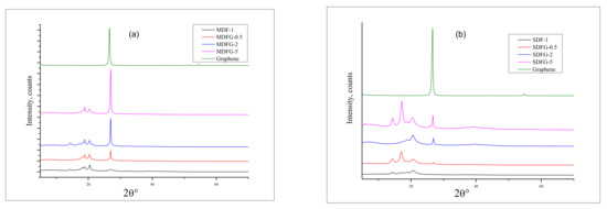 Figure 9a,b shows XRD analysis curves of nanocomposites prepared by two different fabrication methods. Clear characteristic peaks of pristine graphene are observed at two theta values of 26.6° and at 54.6°, which correspond to an interlayer distance of 3.34 Å in a hexagonal structure at 200 orientations and the 004-crystal plane, respectively. For the melt-mixing method, virgin PVDF resin crystallizes, showing the distinct characteristic peaks at 9.5°, 17.5°, 18.5°, 20.5°, and 27.5°, as shown in Figure 9a. Peaks at 9.5°, 17.5°, 18.5°, and 20.5° are assigned to α phase crystals for 100, 020, 100, and 021 reflections, respectively [56]. However, a clear β phase was assigned for virgin PVDF at 27.5°. The presence of various amount of graphene in PVDF was also confirmed in the composites. Higher graphene content showed a higher peak intensity at 28.0°. The intensity of the peaks increased with increasing amounts of graphene [15,55,56,57,58].