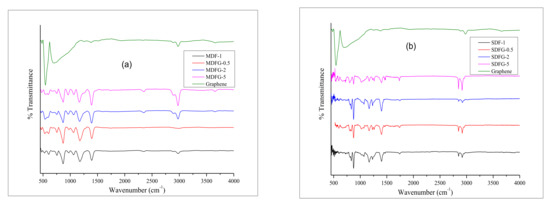 Figure 10 shows the FTIR overlay graphs of pure PVDF, pristine graphene, and various amounts of graphene dispersed nanocomposites prepared by two different methods. In general, PVDF exhibits at least four crystalline phases depending on its preparation and temperature. Thus, the vibrational spectrum of PVDF gives valuable information about the structure of PVDF and can be evaluated by FTIR analysis. Ye et al. [65,66,67,68] investigated vibrational spectra of PVDF extensively. Several characteristic peaks (Figure 10a) of PVDF were observed mainly at 480 cm−1 (-CF2 wagging) γ-phase, 530 cm−1 (-CF2 bending) α-phase, 840 cm−1 β or γ-phase (-CH2 rocking). Similar peaks were also observed by various investigators [58,59,60]. Additional peaks above 1000 cm−1 are proposed for spontaneous polarization [68,69,70]. Characteristic peaks of pristine graphene were observed at 2978, 701, and 544 cm−1. Peak intensities of both nanocomposites increased with increasing graphene content. However, the graphene peak at 2978 shifted to lower values at 2916 and 2848 cm−1, which might be due to phase transformation of PVDF or good melt-mixing behavior that hindered the –CH stretching within the graphene structure [27]. The thermal stability of melt-mixed nanocomposites showed better performance due the phase transformation and well mixing of graphene with PVDF polymers, as concluded above.