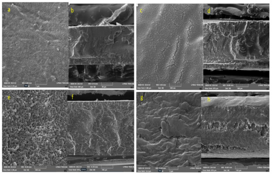 (a) PVDF virgin (SDF) (top surface), (b) SDF fracture surface, (c) SDFG-0.5 (top surface), (d) SDFG-0.5 fracture surface, (e) SDFG-2 (top surface), (f) SDFG-2 fracture surface, (g) SDFG-5.0 (top surface), and (h) SDFG-5.0 fracture surface.