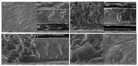 (a) PVDF virgin (MDFG0) (top surface), (b) MDFG0 fracture surface, (c) MDFG 0.5 (top surface), (d) MDFG 0.5 fracture surface, (e) MDFG 2.0 (top surface), (f) MDFG 2.0 fracture surface, (g) MDFG 5.0 (top surface), and (h) MDFG 5.0 fracture surface.