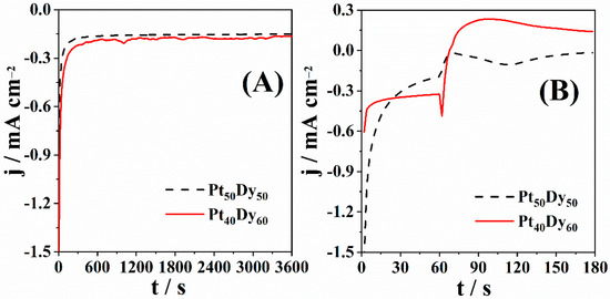The chronoamperometric measurements revealed short-term stability of Pt–Dy alloys’ activity towards ORR with stable cathodic current densities recorded after the initial drop, Figure 3A. As one of the intended applications of Pt–Dy electrodes was as cathodes in AFCs, and their subclass of direct borohydride fuel cells (DBFCs) with NaBH4 as fuel, the selectivity of the Pt40Dy60 electrode for ORR in the presence of NaBH4 was investigated. The chronoamperometric measurements revealed a decrease in cathodic current densities upon the addition of NaBH4, Figure 3B. Furthermore, LSV recorded in O2-saturated 0.5 M NaBH4 + 4 M NaOH solution revealed high positive currents in the expected ORR potential range (not shown). This was somewhat expected as Pt and Pt–Dy alloys were previously reported to be active in the borohydride oxidation reaction [45]. Thus, Pt–Dy electrodes were demonstrated to not be suitable to serve as cathodes in membraneless DBFCs as they are not tolerant to the presence of NaBH4.