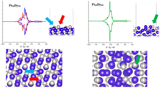 Exposed Pt pair on the Pt50Dy50 surface (left) and exposed Pt atom on the Pt40Dy60 surface, with the corresponding projected densities of states (PDOS). Grey—Pt, blue—Dy atoms.