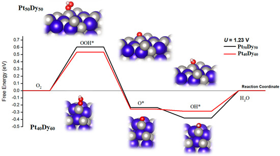The analysis of free energy profiles suggests that the first electron transfer is a potential determining step, in agreement with the experimental results. Moreover, the Pt40Dy60 phase has a lower thermodynamic barrier for ORR by 0.07 eV, suggesting that ORR should be faster on Pt40Dy60 catalysts. Based on the reduction in the barrier, catalytic activity enhancement of the Pt40Dy60 phase compared to Pt50Dy50 should be increased by a factor of 16. Considering that the density of Pt pairs on the Pt50Dy50 surface is two times higher than that of Pt single atom sites on the Pt40Dy60 surface, DFT calculations suggest an eight times higher ORR activity of the Pt40Dy60 catalyst compared to that of Pt50Dy50, which agrees well with the experimental results. Note that we considered an associative mechanism of ORR, and, compared to Pt(111), the reactivity is significantly altered by alloying with Dy [37]. Specifically, the first step on Pt(111), the formation of adsorbed OOH, is exergonic compared to the studied Pt–Dy surfaces [37]. However, we also noted that the unique coordination of single Pt atoms on the Pt40Dy60 surface renders a characteristic behavior. Compared to the Pt50Dy50 phase, OOH is bonded stronger, but OH is bonded weaker, which also points to different oxophilicities of the Pt40Dy60 surfaces and lower surface blockage by OHads in the case of Pt40Dy60. Considering the OER, the reaction profile (Figure 6) suggests a rather high OER overpotential, amounting to 0.84 and 0.79 V for Pt50Dy50 and Pt40Dy60, respectively. This indicates a lower OER activity compared to Pt [37] and somewhat higher OER activity of Pt40Dy60 compared to Pt50Dy50, which is in agreement with the experimental findings (Figure 4). In the case of OER, weak OOH bonding is the main limiting factor. Namely, if one considers Figure 6 in the OER direction (from H2O to O2), it is clear that a large exergonic step going from O* to OOH* determines the OER overpotential. In the case of the Pt40Dy60 catalyst, this step gives a lower barrier, and thus, OER activity is expected to be somewhat higher. In general, the ORR/OER reaction profile for the Pt40Dy60 catalyst is smoother compared to the Pt50Dy50 one, making it overall better for O2 reduction/H2O oxidation. Further improvements in catalytic activity would require additional flattening of the reaction profile. Namely, to boost both ORR and OER activity, one would require to (i) additionally stabilize *OOH and (ii) destabilize both *O and *OH. The first point seems to be of more crucial importance as it largely relates to the improvement of OER activity, while ORR activity of the studied Pt–Dy catalysts is already rather high (Figure 1).
