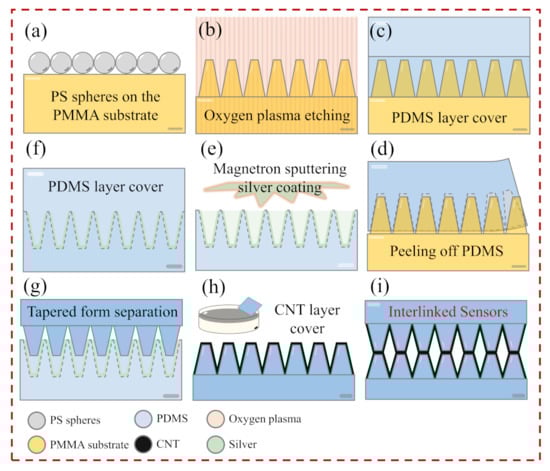 The scheme of fabricating the interlinked resistive sensors: (a) self-assembly of PS microspheres on PMMA substrate; (b) microcone structure was prepared by oxygen plasma etching; (c) PDMS was coated on the microcone structure; (d) PDMS layer on the microcone film was stripped; (e) the silver layer was deposited on the PDMS microporous template by magnetron sputtering; (f) PDMS was coated on the microporous template; (g) PDMS film with tapered structure was stripped; (h) CNTs were coated on the microcone PDMS film; (i) interlock sensor was combined by two microcone films.