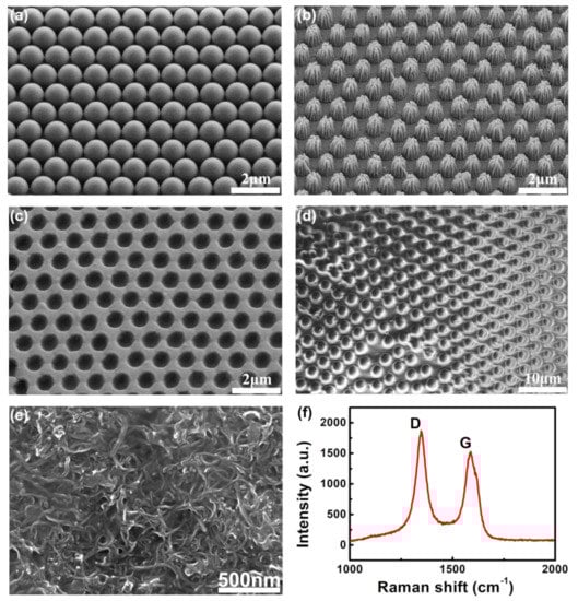 The SEM of fabricating flexible pressure sensor during different processes and Raman spectra of CNTs: (a) the monolayer PS spheres arrays on PMMA substrate; (b) the PS microcone array was etched with oxygen plasma after 6 min; (c) the SEM image of concave PDMS film by the first transferred from the PMMA microcone array template; (d) the PDMS’ SEM image with microcone structure; (e) the SEM image of the CNTs networks covered on the PDMS substrate; (f) Raman spectra of CNTs.