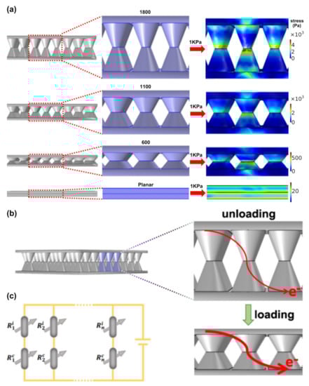 For the pressure of 1 kPa, Figure 3a demonstrates the local stress change of the emulated interlinked highly ordered microcone array and interlinked conductive planar sheet. Here, the heights of the sensor single layer microcone are set to 1800 nm, 1100 nm, and 600 nm and then defined as sensor-1800, sensor-1100, and sensor-600, respectively. The heights of sensor-1800, sensor-1100, and sensor-600 are 3.6, 2.2, and 1.2 m, respectively. The simulated results show that the contact area between interlinked microcones increases, and the height decreases when the applied load increases. In addition, the local stress distribution is concentrated on the contact surfaces between the interlinked microcones. However, the interlinked planar film without microcone array does not exhibit the phenomena of stress concentration. From the simulated results, we can see that sensor-1800 obviously has a wider stress distribution than sensor-1100 and sensor-600. Figure 3b shows the structural schematic drawing of the interlinked microcone array under normal and loaded conditions. The interlinked microcone array’s reaction to stress is proportional to its height and the contact area between the microcones. In this situation, the contact resistance () and the intrinsic resistance () between the two face-to-face microcones constitute the resistance of the interlinked microcone array, as reflected by the resistive properties of the conductive film, which may be stated as