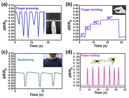 (a) The measurement of a finger pressing, inset: photo of finger pressing pressure sensor; (b) finger bending produces responsive curves (0°, 30°, 60°, and 90°), illustration: photo of pressure sensor fixed to finger; (c) detection of motion in the human larynx during swallowing; (d) the sensor’s resistance varies when it is fixed in the folds of cardboard.