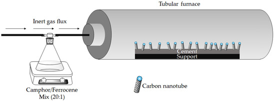 The cement used in this study is an American Petroleum Institute (API) oil-well cement Class G (Lafarge North America, Reston, VA, USA). Camphor (purity > 99%) and ferrocene (purity > 99%) were purchased by Sigma-Aldrich (Darmstadt, Germany) and used without any further purification for CNT production. CVD process was run accordingly with that reported by Musso et al. [31], using camphor and ferrocene with a ratio of 20:1 by weight and a camphor/cement ratio of 1 by weight. Cement clinker was placed inside the reactor and heated at 1000 °C; once the temperature was reached, a flux of argon was used to carry the vapors of the camphor/ferrocene mixture into the reactor, as shown in Figure 1.
