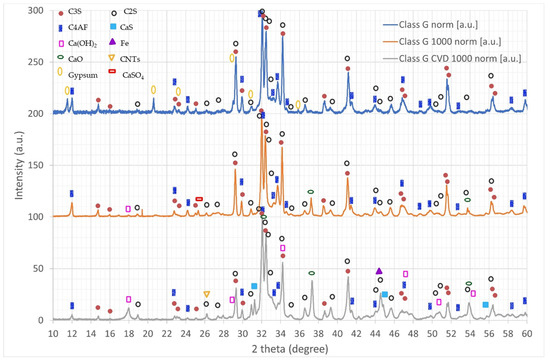 The XRD spectra taken on pure cement clinker, cement clinker annealed at 1000 °C, and after the growth of CNTs are reported in Figure 4. Their analysis shows a complex phase composition. In the pristine class G cement clinker, the presence of the main cement phases is evident: bicalcium silicate (C2S), tricalcium silicate (C3S), calcium ferroaluminate (C4AF), calcium sulfate dihydrate (gypsum). Distinguishing between C2S and C3S is not easy, since the peaks are often superimposed. It seems that the main phase between the two is C3S, with only a minor contribution of C2S.