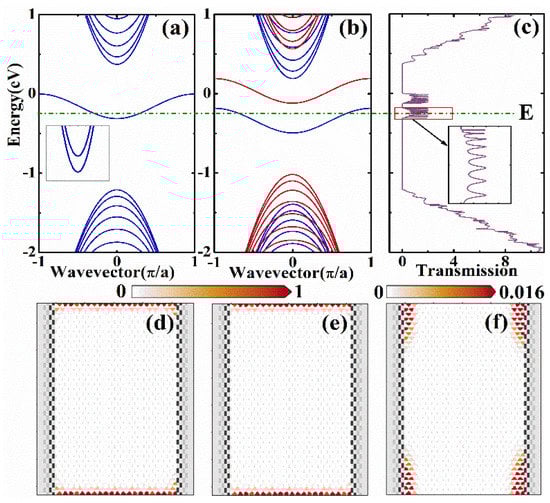 In Figure 2d−f, we plot the LDOS of the device at energy (the dashed green line). In Figure 2d, we show the total LDOS, including spin-up and spin-down electrons, and it is found that the LDOS is localized near the ribbon edges. This means that electrons from the quasi-flat band only move on the edges, which offers us a possibility to control the transport by modifying the edge states. In Figure 2e,f, we show the LDOS for down spin and up spin, respectively. We can see that electrons move at the edge, and only spin-down electrons can transport from the left lead to the right lead.