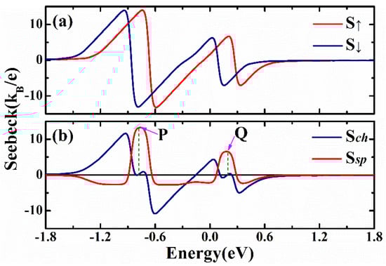 In the following discussions, we consider the spin-dependent Seebeck coefficients for a phosphorene nanoribbon with a ferromagnetic stripe; then, we show the enhancement of Seebeck coefficients via the modifications of the edge states of zigzag phosphorene nanoribbons. In Figure 3a, the spin-up and spin-down Seebeck coefficients are plotted as a function of the Fermi energy. It is noted that both spin-up and spin-down Seebeck coefficients oscillate with the Fermi energy with different dependences. The amplitudes of Seebeck coefficients are large in the energy region . The positive peak height is around , and the negative peak height is around . The spin and charge Seebeck coefficients are shown in Figure 3b. We can see that the amplitudes of the spin Seebeck coefficient can be as large as , and the amplitude of the charge Seebeck coefficient can reach . Moreover, we could obtain some energy points that had spin a Seebeck coefficient but zero charge Seebeck coefficient. For example, the spin Seebeck coefficients for points P and Q are and , respectively, but the corresponding charge Seebeck coefficients are zero.