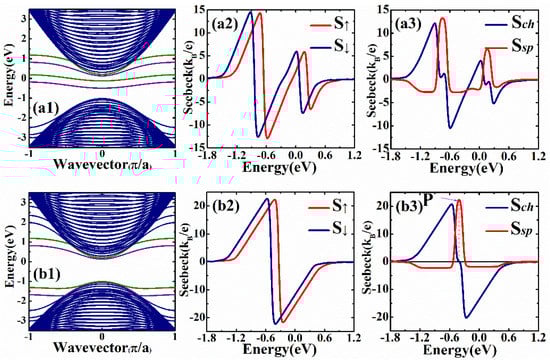 The band structures and spin-dependent Seebeck coefficients for the device with different voltages applied on the left and right edges of the ribbon. (a1–a3) The gate voltage is only applied on left edge with and . (b1–b3) The gate voltages are applied on both edges with and . The other parameters for the device are: exchange splitting and temperature .
